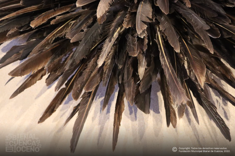 En su transitar diario por la playa, la artista recogió la arena, encontró y recolectó las plumas para materializar esta instalación.