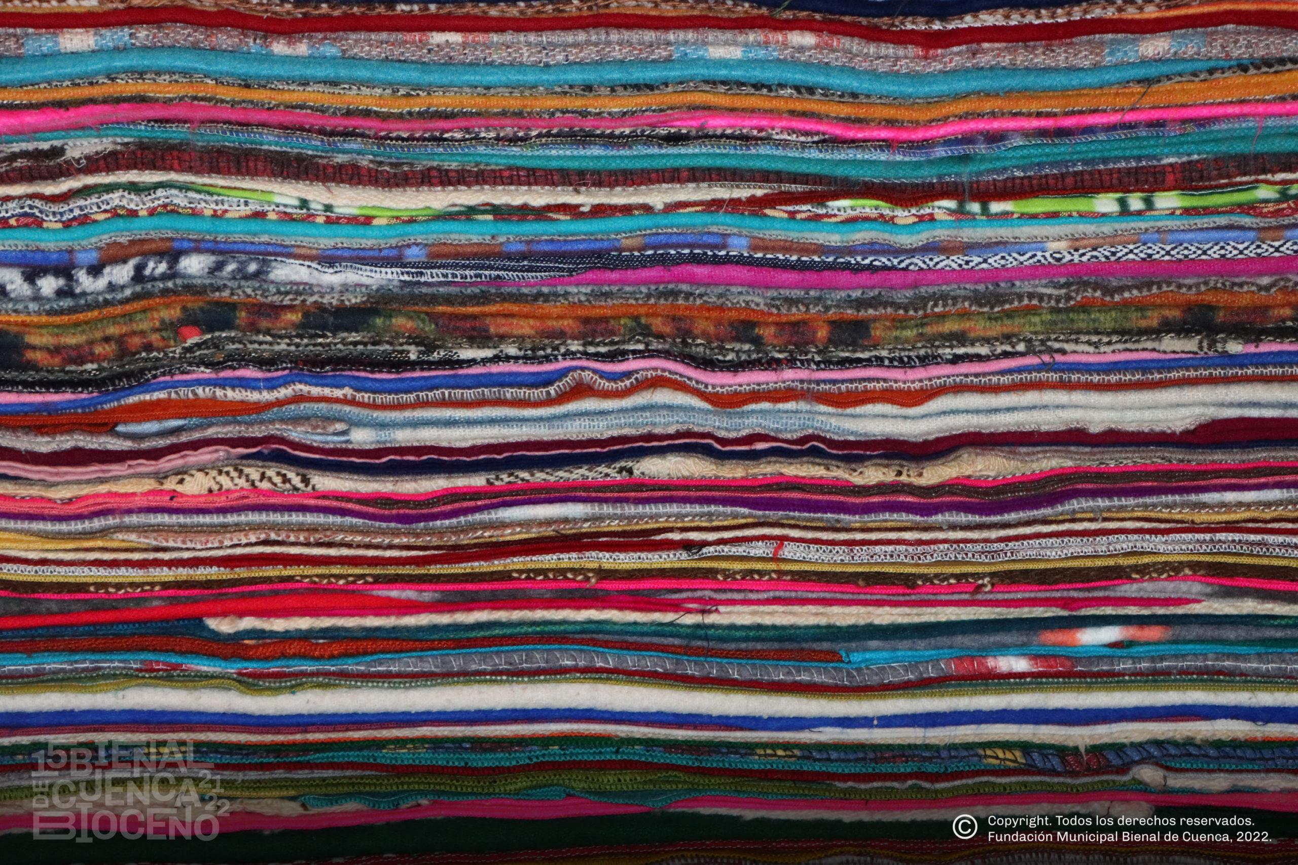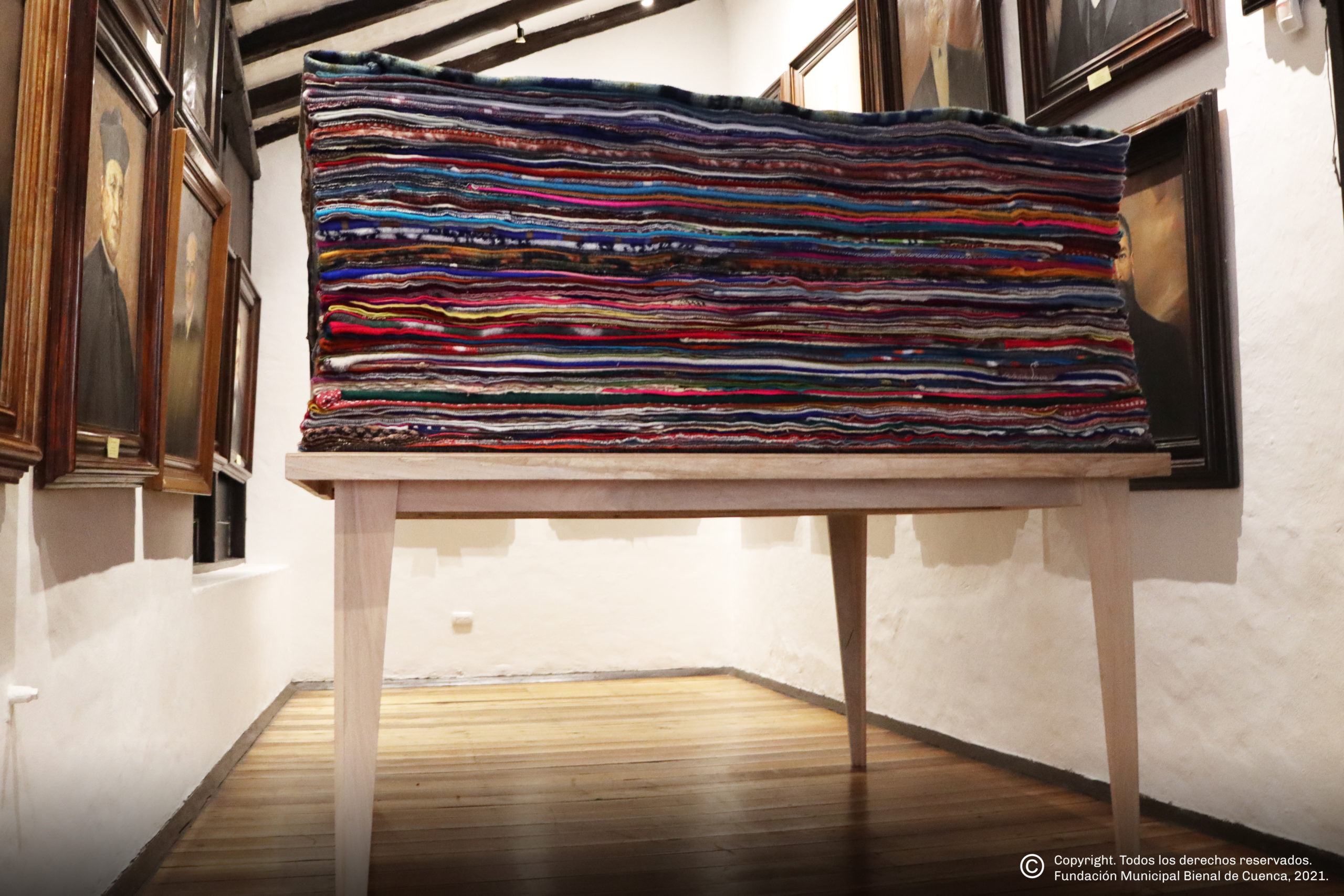 La artista concibe una instalación específica para esta sala tomando como base las mantas tradicionales ecuatorianas, algunas de donaciones y otras adquiridas a comunidades de mujeres artesanas o comerciantes. Cosidas unas a otras y dobladas de manera continuada, realiza una escultura del tamaño exacto que ocupan los retratos de las presidentas, tapándolos de modo similar a la forma en que se han ensombrecido las figuras femeninas en la historia del arte y de los espacios culturales.
